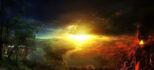 A Scene Of A Forest With A Large Tree And A Large Hand Wallpaper -