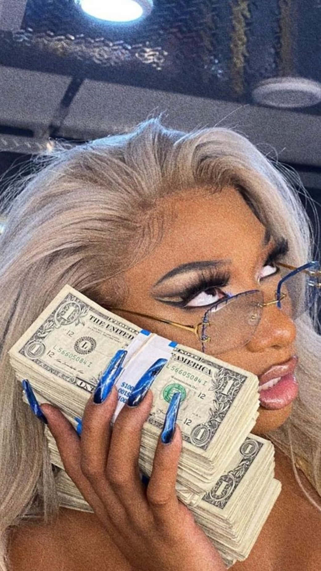 A Girl Laying On A Bed With A Bunch Of Money Wallpaper -