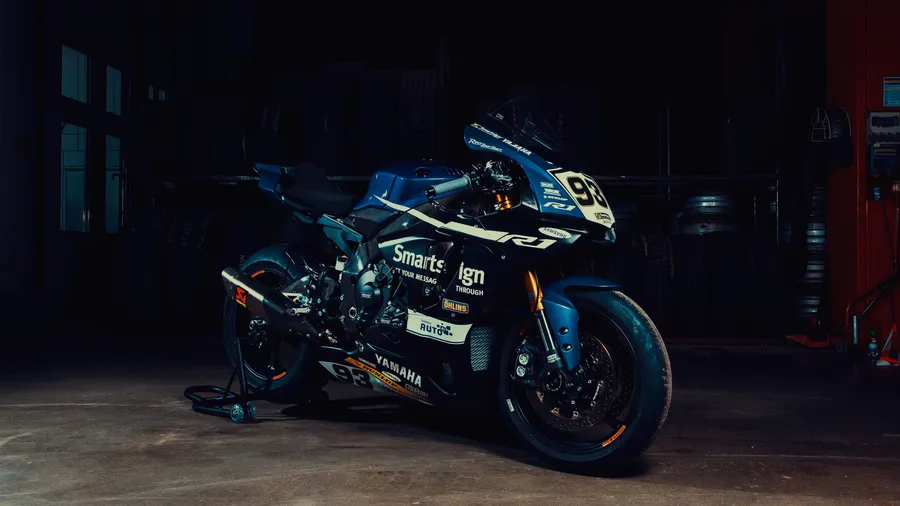 A Black And White Motorcycle Is Parked In A Dark Room Wallpaper -