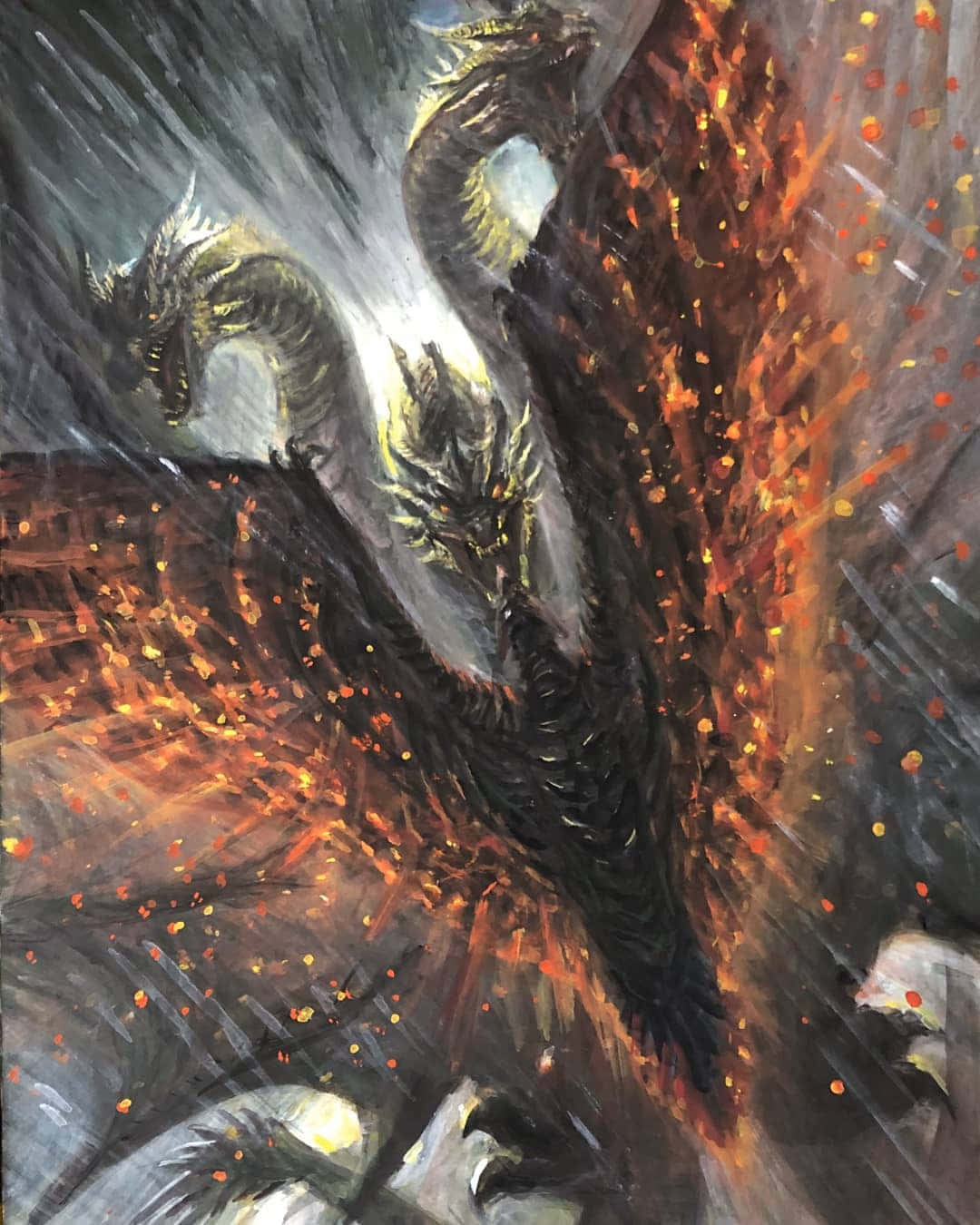 A Dragon Flying In The Sky With Fire Wallpaper -