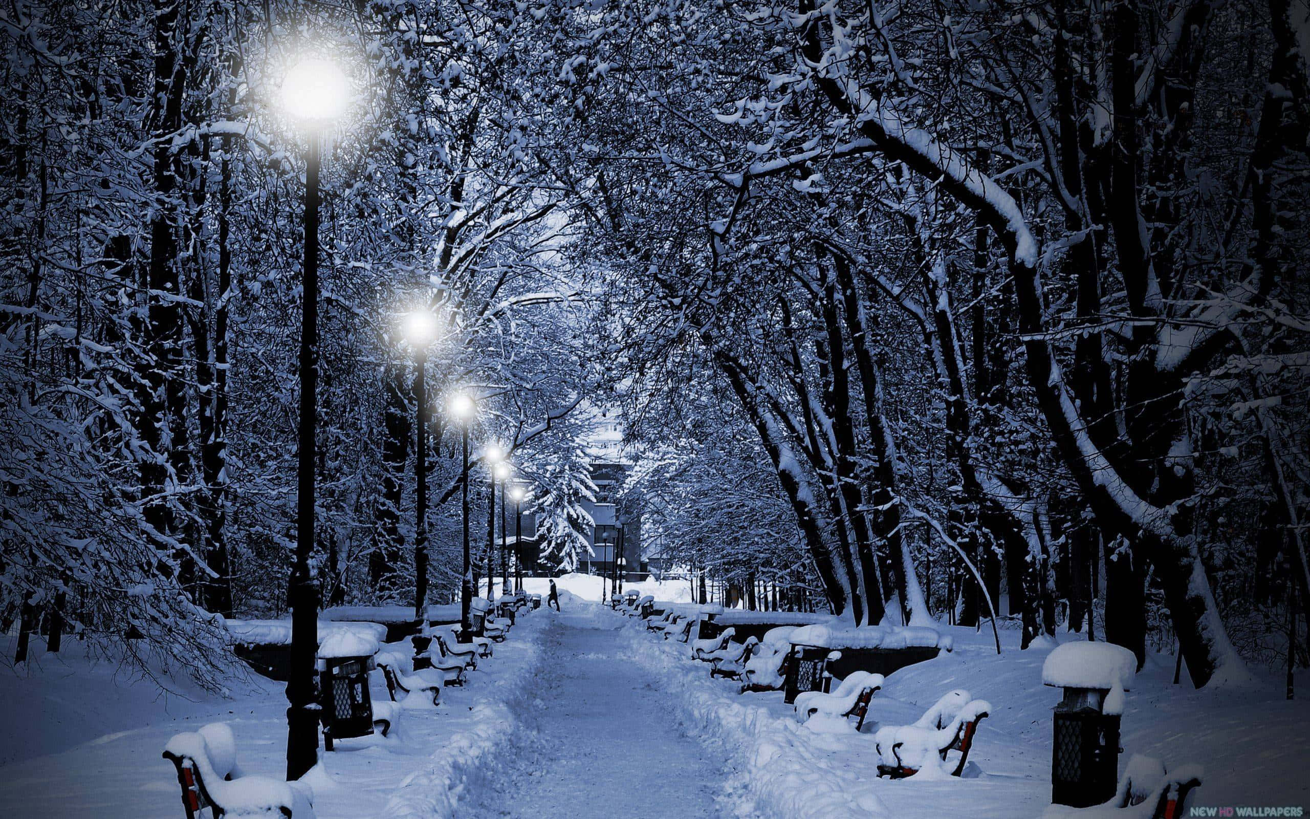 Enjoy The Beauty Of A Snow-covered Winter Night Wallpaper -
