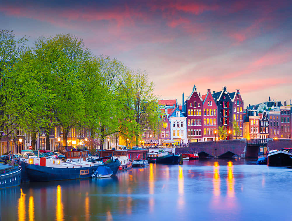 A Scene Resting On The Waters Of Amsterdam In Springtime Wallpaper -