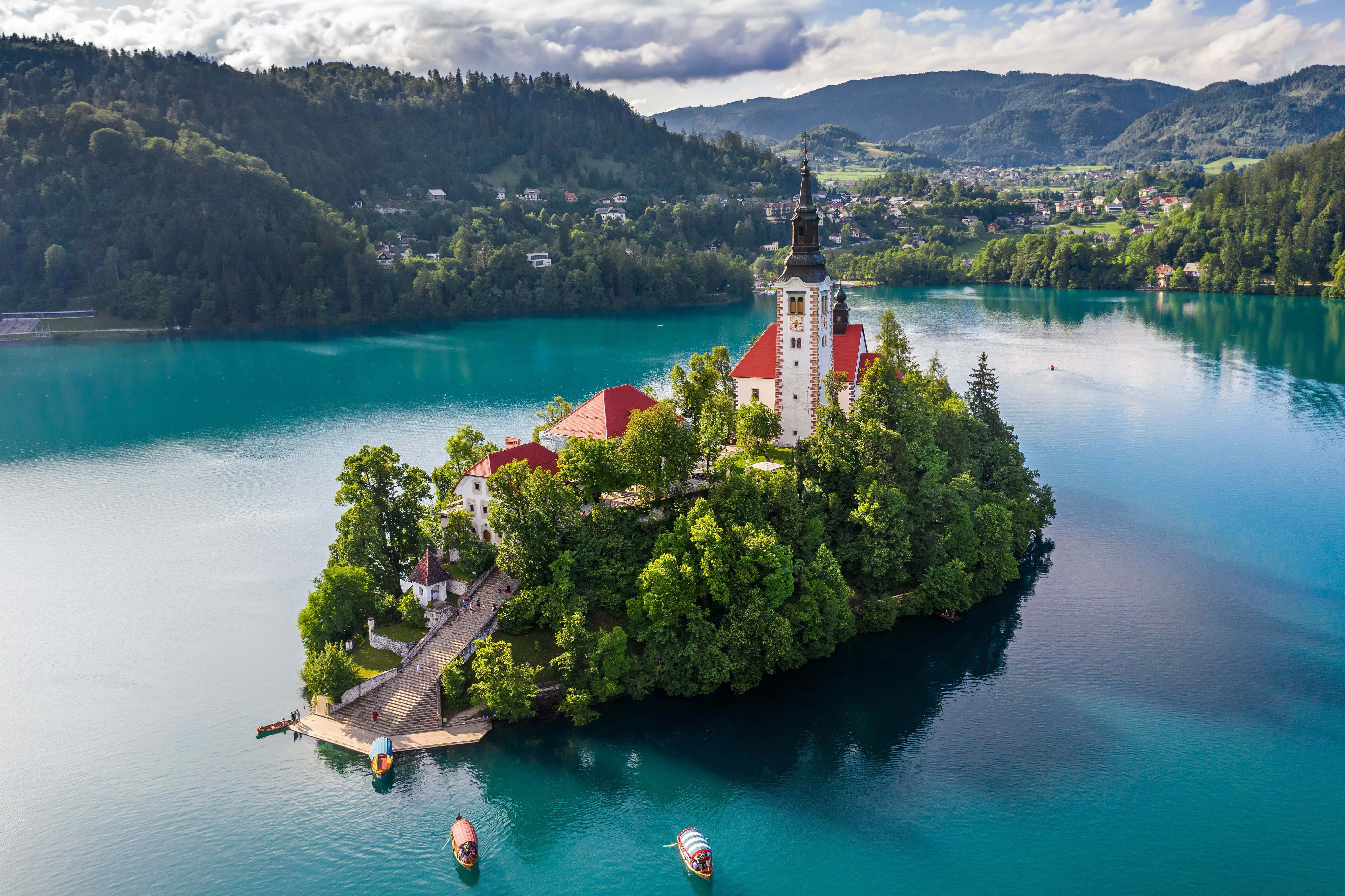 Aerial View Of The Bled Island In The Middle Of Lake Bled Wallpaper -