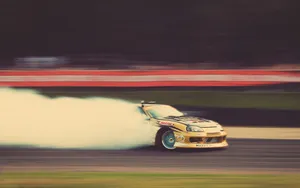 A Car Is Drifting On A Track With Smoke Coming Out Of It Wallpaper -