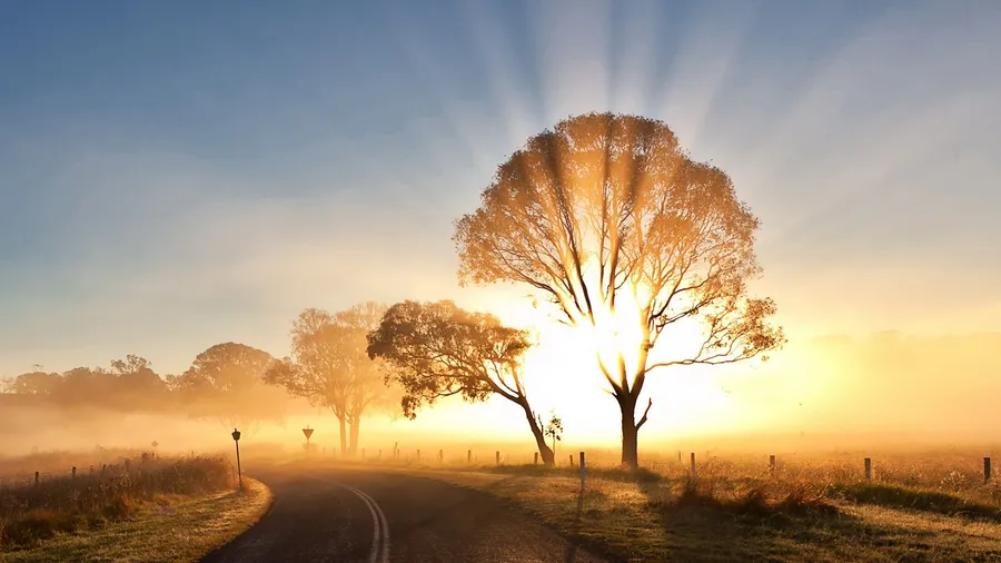 Radiant Dawn: Sun Rising Over Beautiful Landscape Wallpaper -