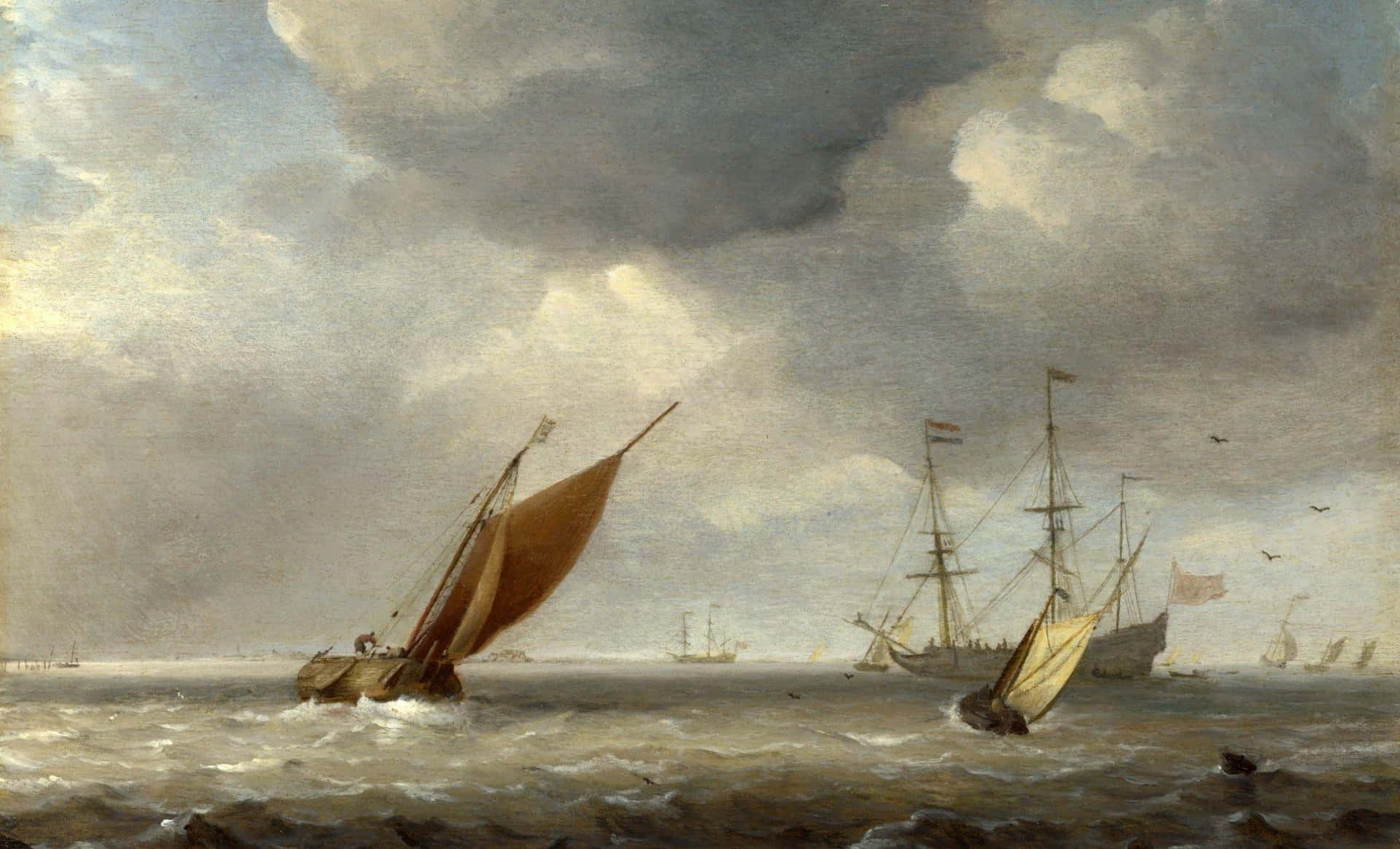 A Painting Of Ships In The Ocean Wallpaper -