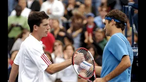 "tim Henman And Roger Federer Mid-game Handshake" Wallpaper -