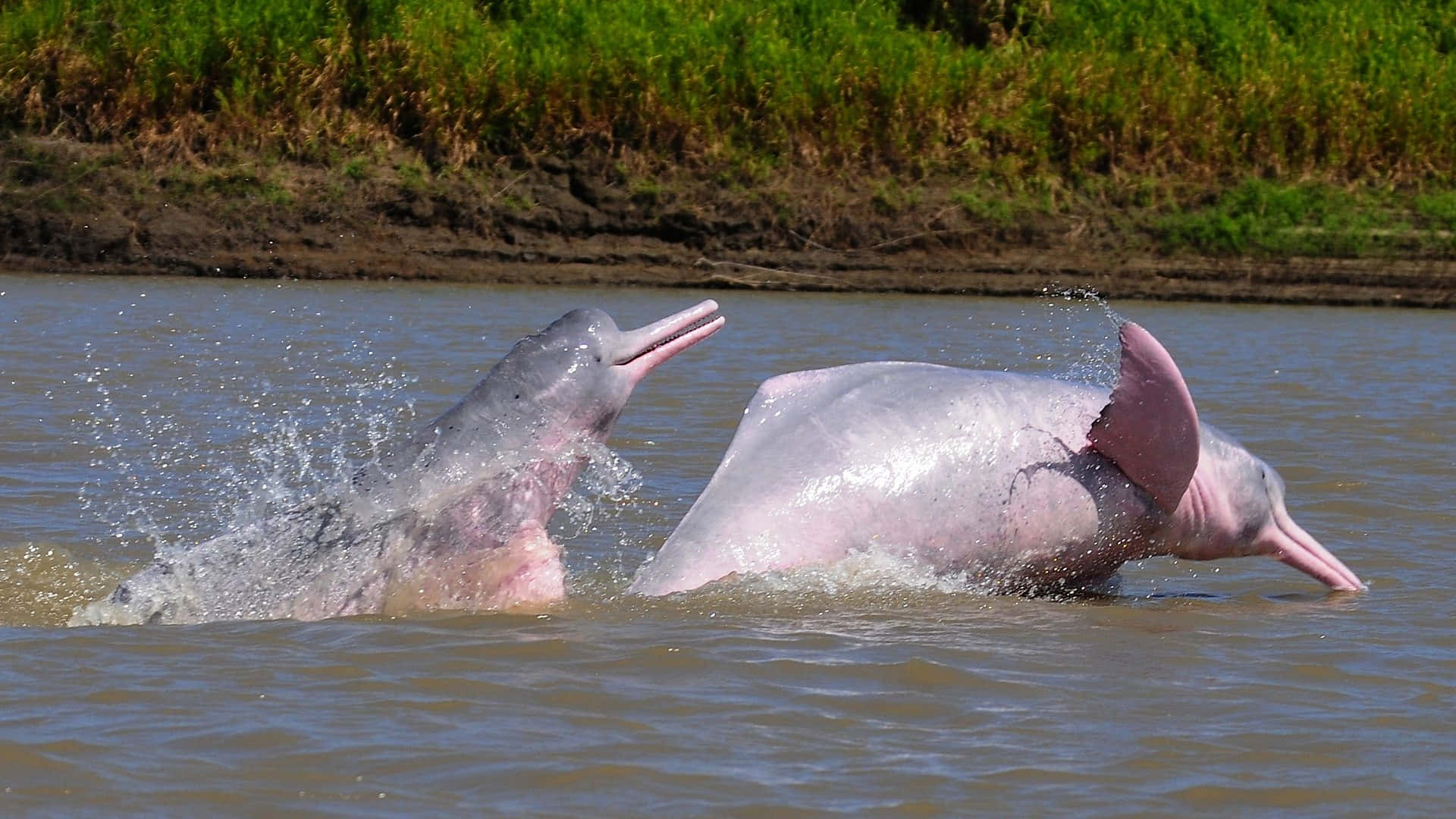 A Pair Of Playful Pink Dolphins In Their Natural Habitat. Wallpaper -