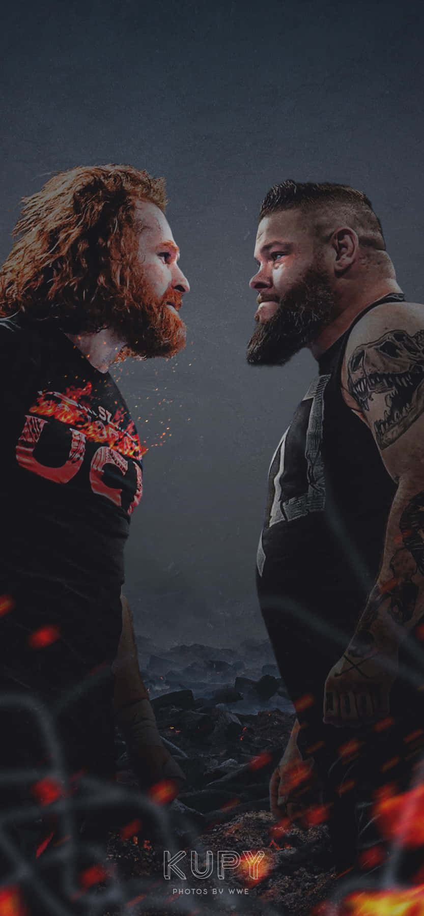 Two Wrestlers Standing In Front Of Fire Wallpaper