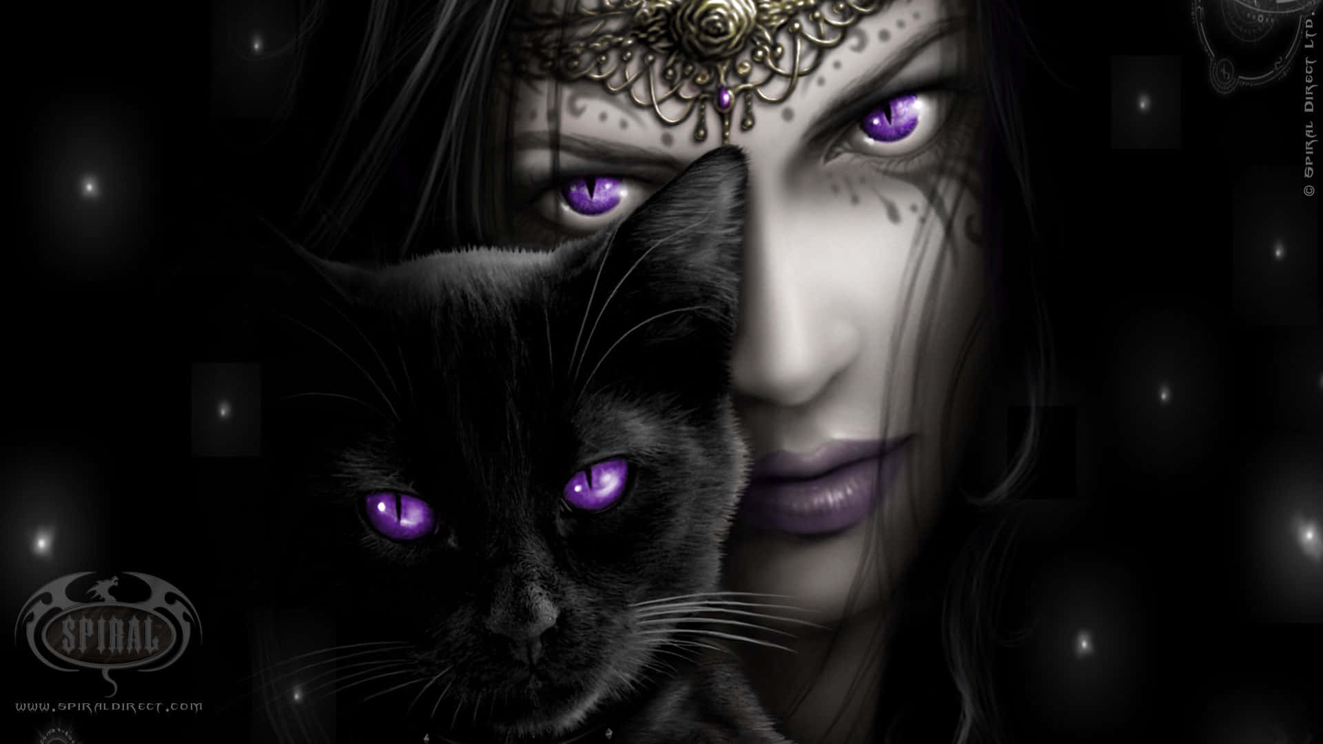 A Woman In Black Makeup Sitting On A Couch With Two Black Cats Wallpaper -