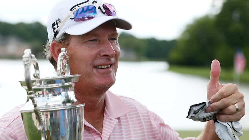 Woody Austin Holding A Golf Club Over His Shoulder Wallpaper -