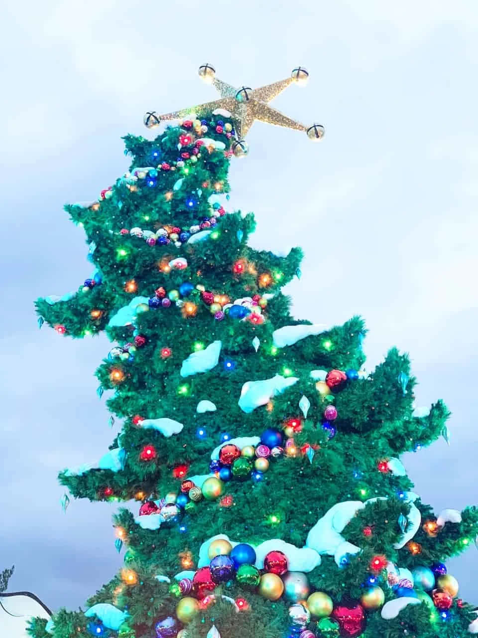 A Christmas Tree With A Lighted Ornament On Top Wallpaper